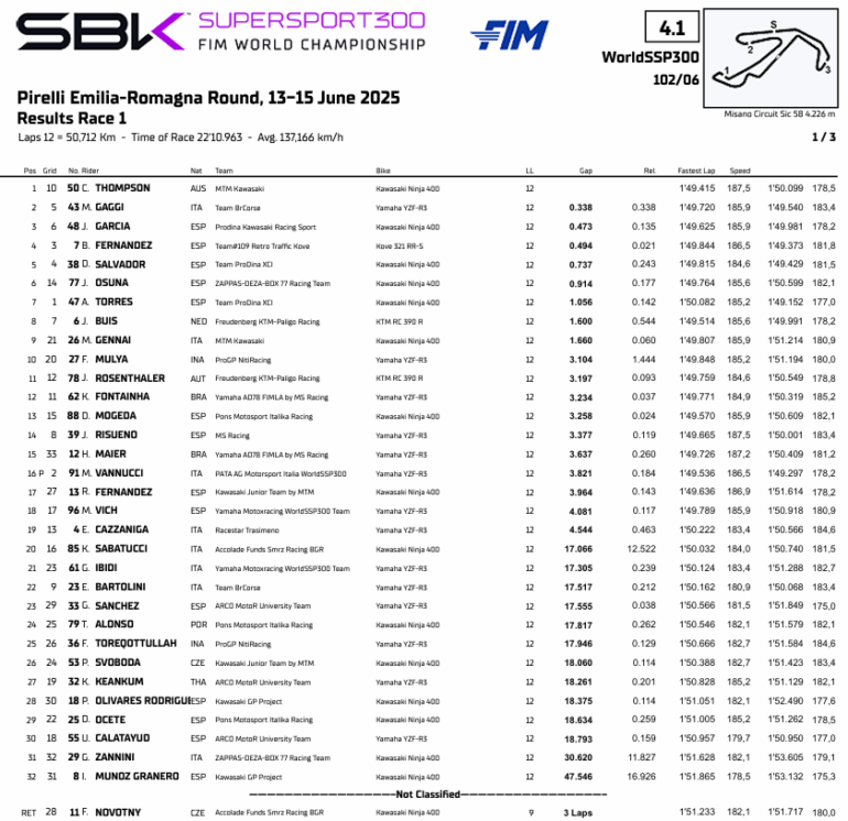 El australiano Carter Thompson, por primera vez, y el español Beñat Fernández, ahora líder del campeonato por un punto, fueron los ganadores de las dos finales de la 4ª Fecha del Mundial de Supersport300. Ambos pilotos corren actualmente la Red Bull Rookies Cup MotoGP.
