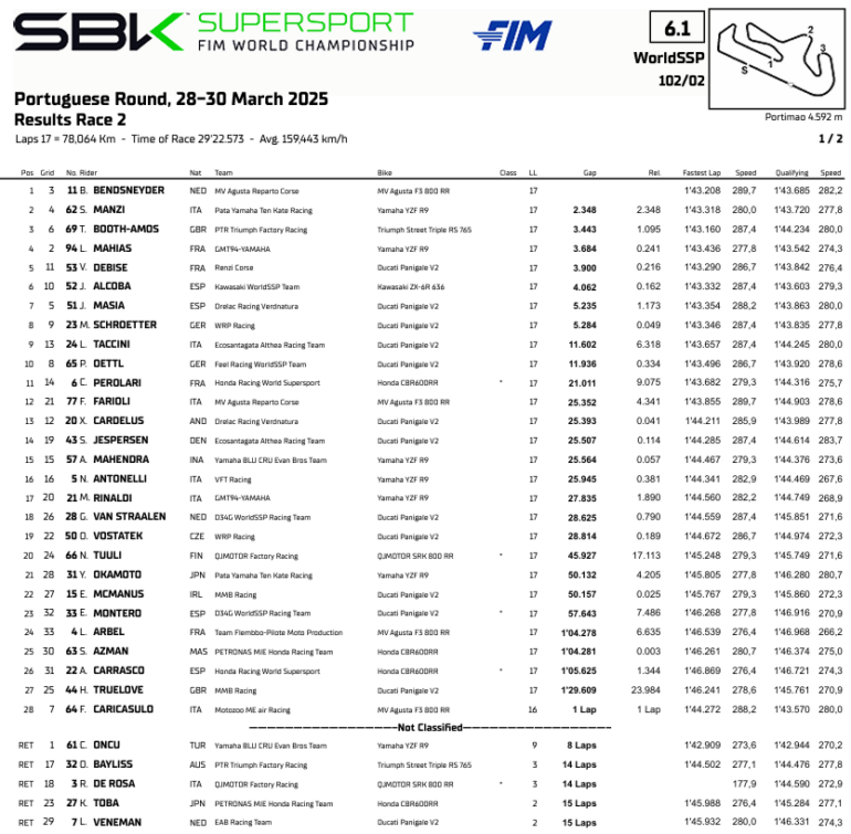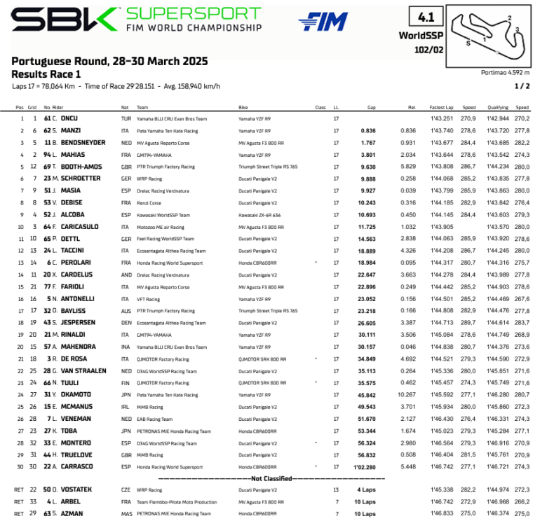 El turco y el holandés se quedaron con los triunfos de la 2a Fecha del Mundial de Supersport600. Ambos campeones de la Red Bull Rookies Cup y con paso por Moto3 y Moto2, ahora son protagonistas del Mundial de 600. Can Oncu se impuso en la Carrera 1 mientras que Bendsneyder en la Carrera 2. El líder del campeonato es Stefano Manzi. El italiano hizo podio en las dos finales siendo segundo de ambos y es puntero con 13 de ventaja sobre Tom Booth-Amos.