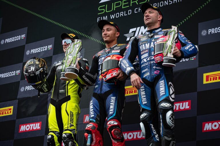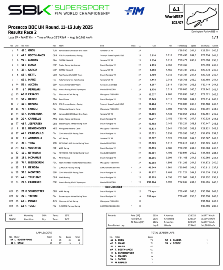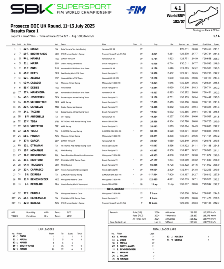La carrera 1 de Supersport en Donington Park fue muy importante para Stefano Manzi y sus opciones de título. Su quinta victoria de la temporada lo mantuvo líder del mundial con distancia de 61 puntos sobre Can Öncü, que no pudo subir al podio. Tom Booth-Amos le hizo fuerza al italiano, pero una salida de pista y posterior sanción se lo impidieron. El francés Lucas Mahias completó el podio.