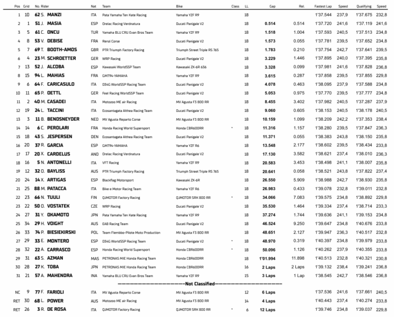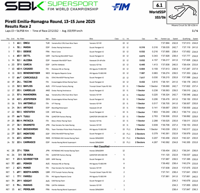El campeonato del Supersport600 tiene un dominador: Stefano Manzi con Yamaha. Sin embargo el turco Can Oncu no baja los brazos en la lucha por descontarle puntos. Tras la victoria del sábado, Manzi venía por el doblete pero se cayó a pocos giros de iniciada la competencia y le dejó a Oncu la posibilidad de descontar una buena cantidad de puntos. El turco, hermano mellizo de Deniz que corre en Moto2, la aprovechó y cerró su cuarta victoria del año más un doblete de podio ya que el sábado fue tercero.