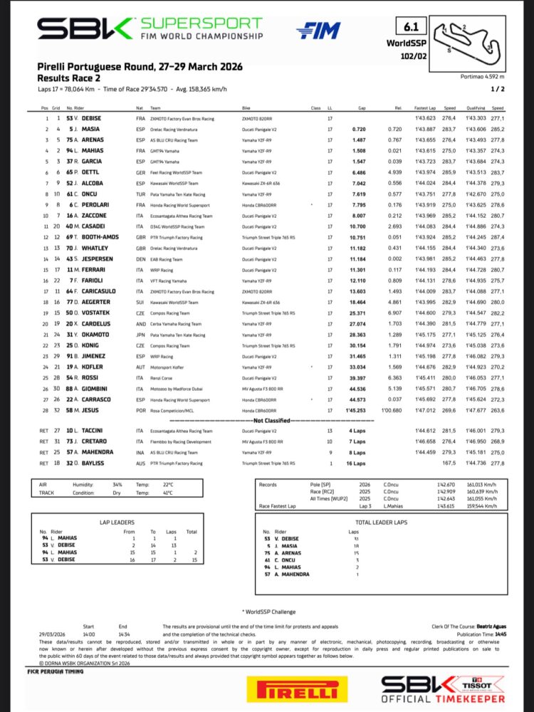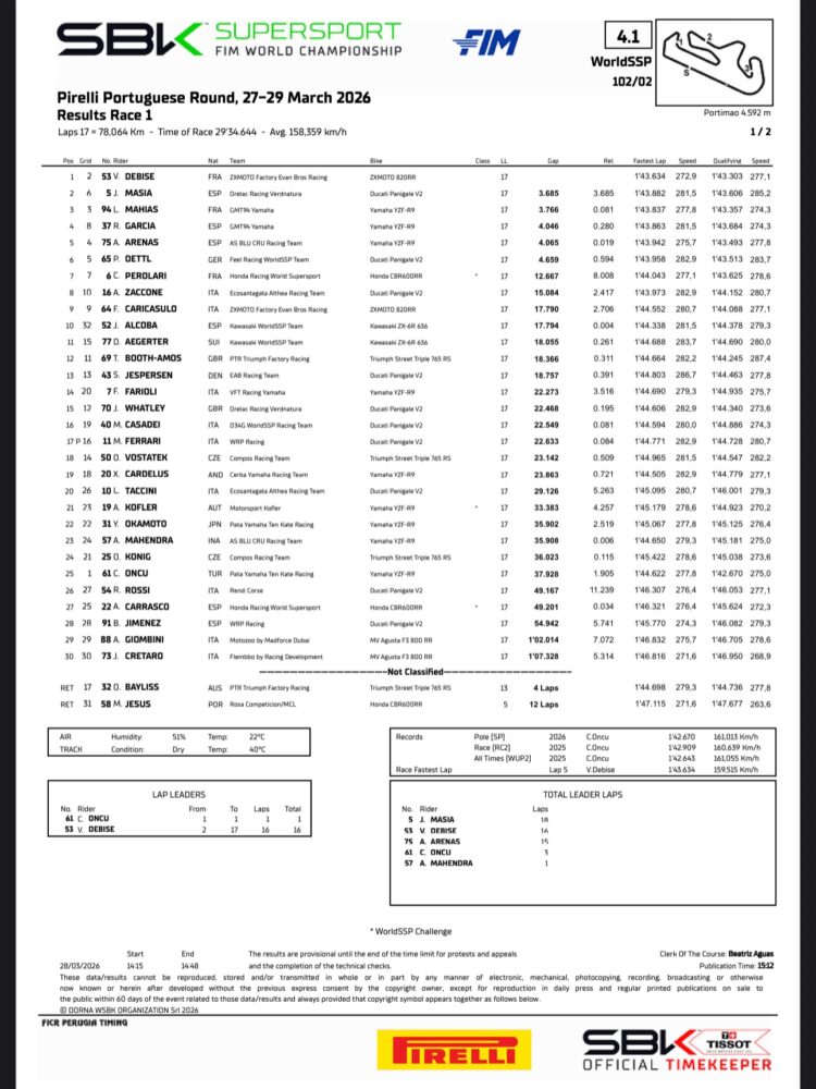 Valentin Debise (ZXMOTO Factory Evan Bros Racing) le dio la primera victoria de ZXMOTO en el Campeonato del Mundo FIM Supersport con autoridad durante el Round Pirelli de Portugal. Jaume Masià (Orelac Racing VerdNatura) sumo su segundo podio del año con la segunda posición, mientras que Lucas Mahias (GMT94 Yamaha) completó el top 3 con su 35º podio en la categoría.
