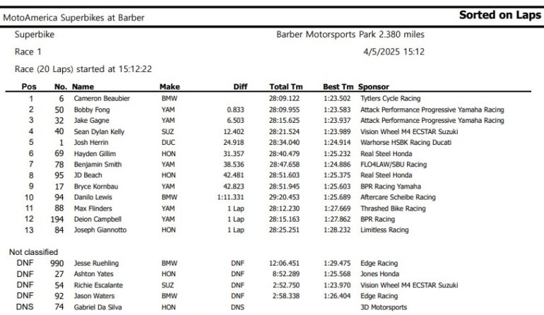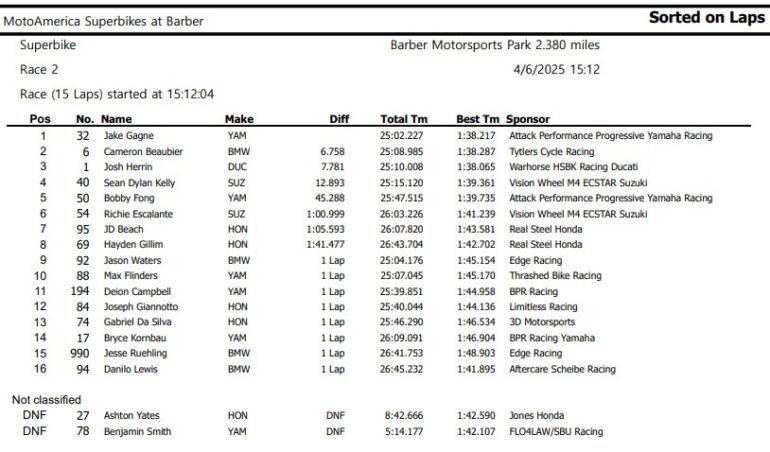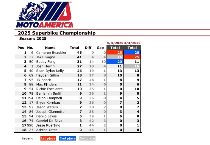 En la primera fecha del Campeonato MotoAmerica Superbike de la temporada 2025 ganaron Cameron Beaubier (el sábado) y Jake Gagne (el domingo). En el Barber Motorsports Park ambos pilotos a su vez ocuparon el segundo puesto y se fueron de Alabama con el mismo puntaje.