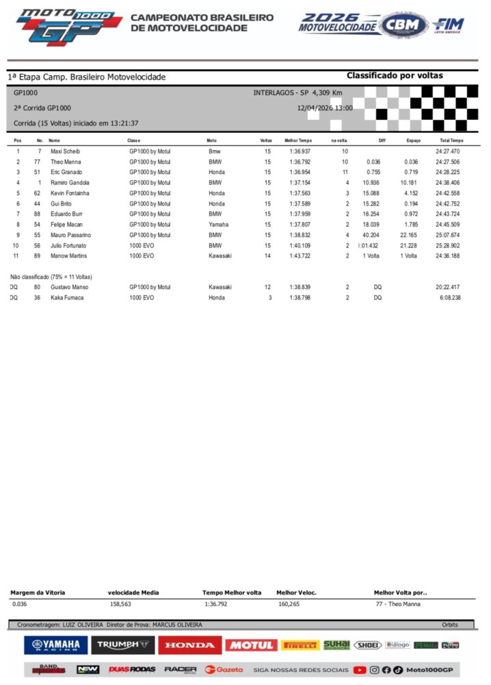 En una tremenda carrera Sprint y en otro gran duelo de carrera larga, la Categoría más importante del Campeonato de Motovelocidade de Brasil, arrancó el año con todo. El GP1000 tuvo a dos mundialistas ganadores: Eric Granado el sábado y Maximilian Scheib el domingo. Ramiro Gandola, actual tricampeón, fue cuarto en ambas carreras.