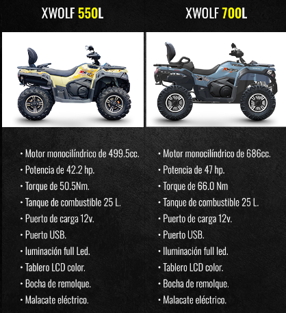 El XWOLF 550L, trata de un motor monocilíndrico de 499,5 cc, con una potencia de 42,2 CV y un torque de 50,5 Nm. La capacidad del tanque de combustible es de 25 litros y posee diversas comodidades, tanto en confort para la conducción, como en detalles modernos como puerto de carga de 12 V, puerto USB; iluminación full LED, tablero LCD color, entre otras. Viene incluida la bocha de remolque y el malacate eléctrico.