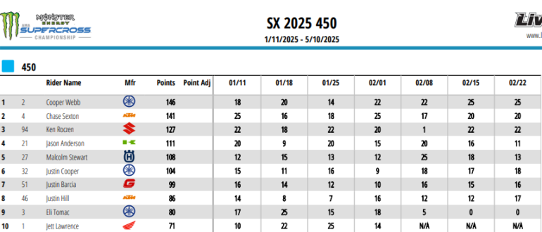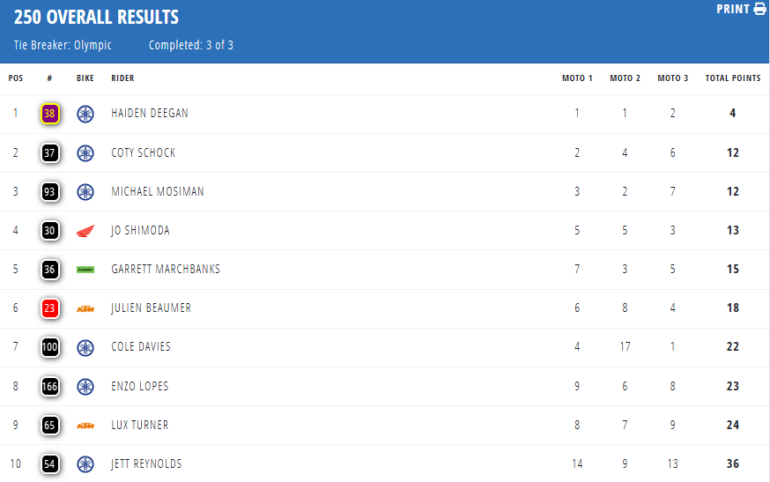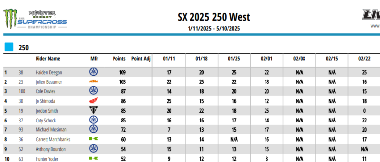 En Clase 250 Oeste, Haiden Deegan (Yamaha) también celebró con el Star Racing con un contundente 1-1-2. La mala noticia del fin de semana fue que Jordon Smith (Triumph), quien venía de hacer historia al hacer ganar a Triumph por primera vez en AMA Supercross: una fuerte caída en la primera manga en la zona de whoops le generó una perforación de pulmón y fracturas de costillas.
