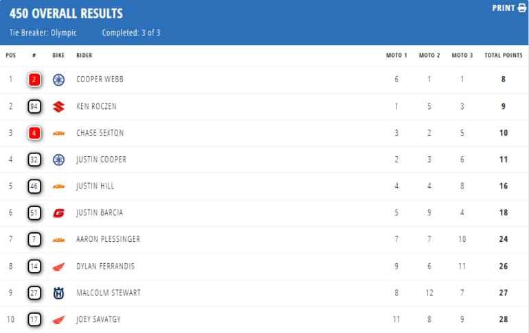 La superioridad de Webb, ganador en 7 de las últimas 9 carreras en Arlington, se vio amenazada por Ken Roczen (Suzuki), quien hizo un 1-5-3, pero que no fue suficiente para frenar el 6-1-1 del ahora líder en solitario del campeonato de la Clase 450. Sexton, quien estaba por llevarse la general, tuvo un contacto con Webb en el último giro de la tercera manga, y echó todo por tierra; quedó tercero en el podio con 3-2-5.