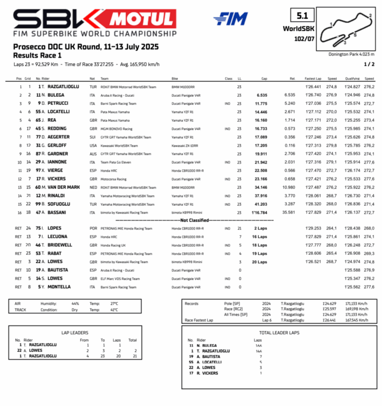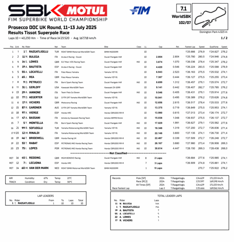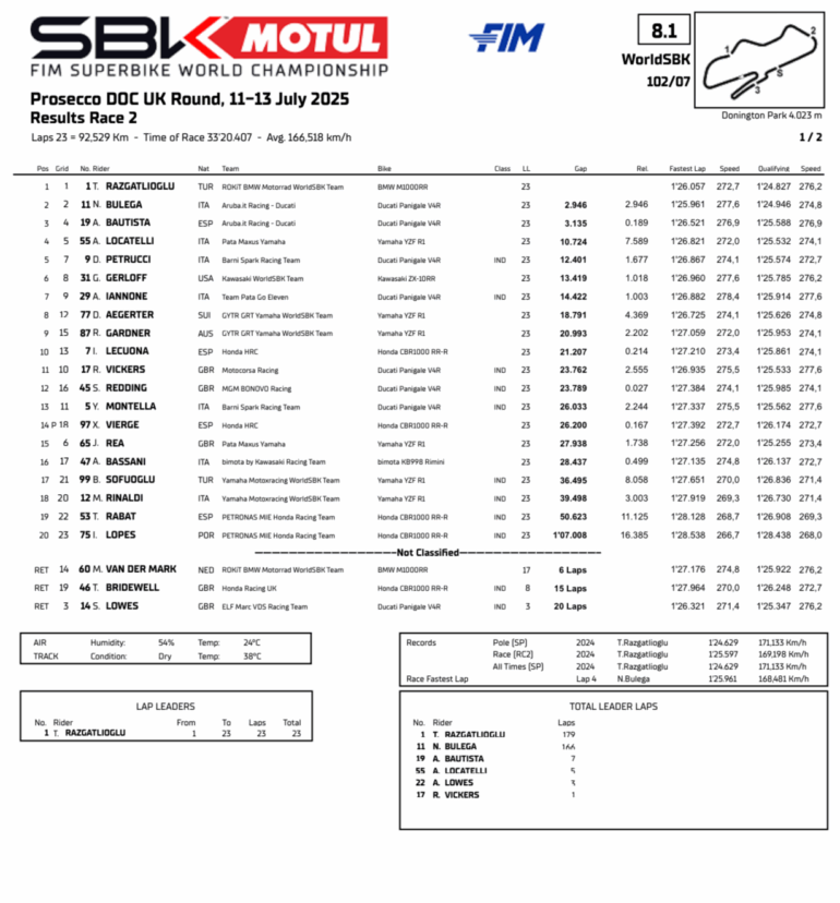 Toprak Razgatlioglu no solo logró el triplete (el tercero de la temporada) en Donington sino que superó a Nicoló Bulega en la clasificación para ponerse líder: 345 a 341 y en dos semanas (25 al 27 de julio), se vuelven a poner en juego en Hungría, en nuevo circuito, más lucha por el título.