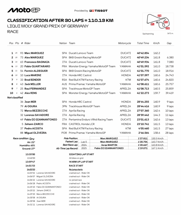 El Gran Premio de Alemania tuvo la fecha con menos finalistas al cierre de competencia: 10. Por lesión no estuvo Somkiat Chantra y por apendicitis Enea Bastianini. Por caídas y lesiones de sábado Maverick Viñales y Franco Morbidelli. El italiano tuvo una barrida a altísima velocidad durante la Sprint y se lesionó, como Viñales, en el hombro izquierdo. El español se cayó en Q2 de Clasificación y se fracturó lo que no estará en República Checa.