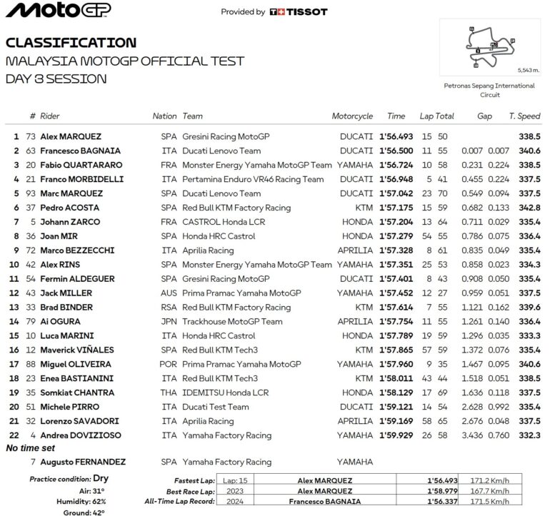 Francesco Bagnaia terminó los test a sólo 0.007 con la Ducati GP25. El director del equipo, Davide Tardozzi, envió a Pecco y a Marc Márquez a la pista para una simulación de sprint race y por primera vez el verdadero potencial del último material procedente de Bolonia le dio más referencia a todos. Marc quedó 5° con un tiempo de 1:57,9.