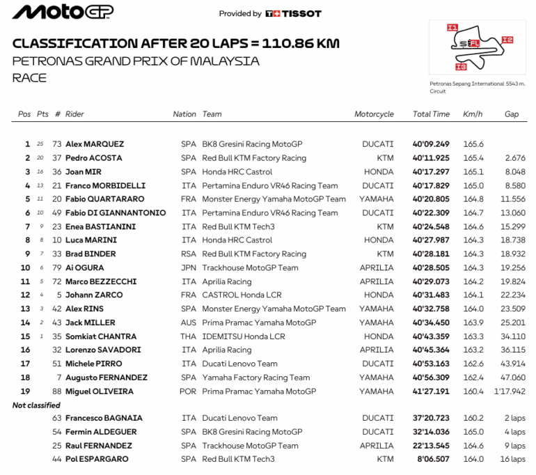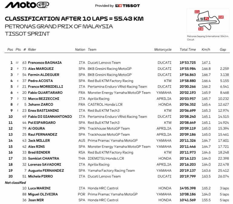 Francesco Bagnaia (Ducati Lenovo Team) logró una gran victoria la Carrera Sprint del GP de Malasia, liderando de principio a fin y desde la Pole. Pecco cambió un fin de semana negro por uno rojo: de penúltimo y caída en Australia, a mejor tiempo y victoria de carrera de sábado. Detrás del italiano se ubicaron Alex Márquez (BK8 Gresini Racing MotoGP) y Fermín Aldegue, compañero de Alex, quien fue tercero y se aseguró el título de ‘Rookie del Año’.