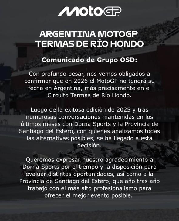 “Con profundo pesar, nos vemos obligados a confirmar que en 2026 el MotoGP no tendrá su fecha en Argentina, más precisamente en el Circuito Termas de Río Hondo.