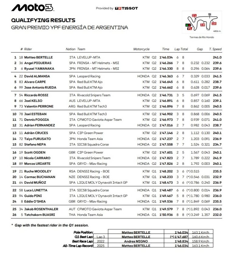 El italiano Matteo Bertelle se quedó con el mejor tiempo de Clasificación en Moto3. Ángel Piqueras y Ryusei Yamanaka terminaron en el podio de la Qualy. El argentino Valentin Perrone superó entró a Q2 y finalizó entre los mejores 10: P9 para cerrar la tercera fila de la carrera del domingo 16 de marzo pactada para las 12 horas.