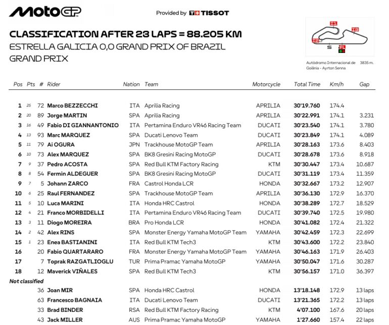 En tanto Jorge Martín, que fue 3° en Sprint y 2° en carrera, logró su primer podio en un GP de MotoGP desde que fue tercero en el GP Solidaridad de 2024 (hace 490 días). Aprilia, además consiguió cuatro victorias consecutivas en carreras por primera vez en su historia y décima de MotoGP. Es el tercer doblete para la marca de Noale, sumándose a los de Cataluña 2023 (con ambos pilotos oficiales) y Valencia 2025.