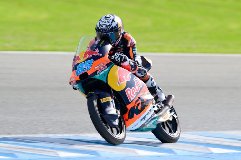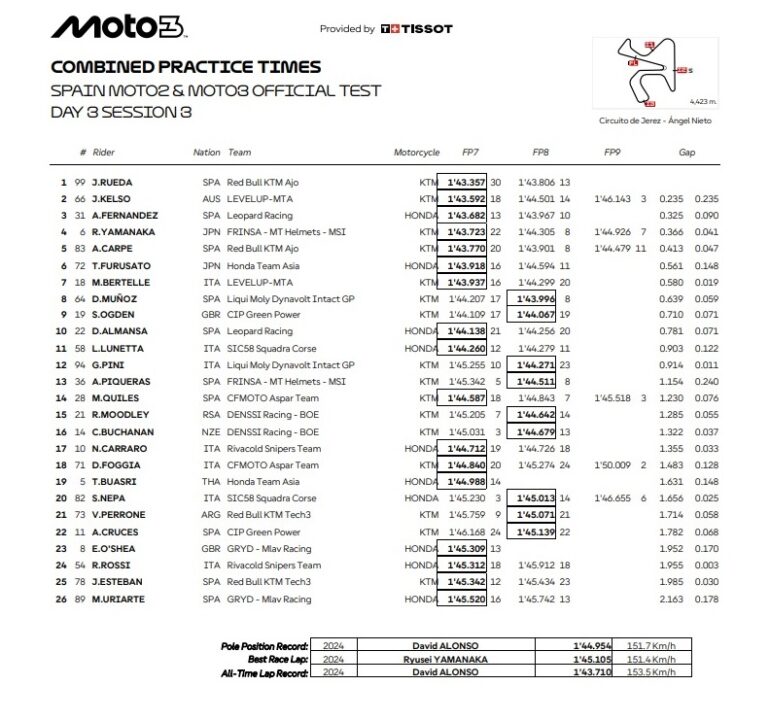 En Moto3, José Antonio Rueda, se marchó del circuito de Jerez con una vuelta de récord. Joel Kelso y Adrián Fernández le siguieron en 2º y 3º lugar, mientras que el debutante Álvaro Carpe (KTM) fue quinto sorprendiendo a todos por su buen paso a lo largo de estos tres días.