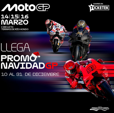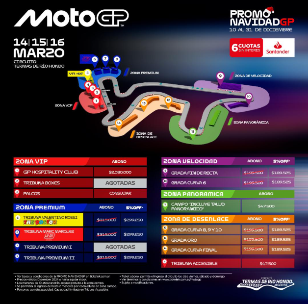 Hasta el 31 de diciembre, las entradas para ver el MotoGP en Las Termas de Río Hondo, están con 5% de descuento utilizando el código PROMOGP al momento de pagar. Este descuento no aplica sobre el «Service Charge». Es una gran oportunidad para hacer un regalo a un ser querido, aunque ese ser querido sea uno mismo.