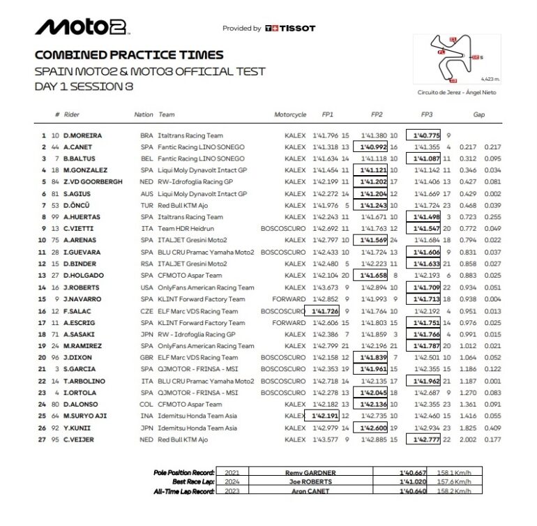 Sin embargo, en la última tanda programada apareció el paulista, radicado en Alcarras, Cataluña; Diogo Moreira (Italtrans Racing Team) que con un tiempo de 1.40.775, mejoraba en dos décimas el mejor registro de Canet, logrando finalizar la jornada en lo más alto de la tabla de tiempos con Aron Canet segundo con 1.40.992, mientras Barry Baltus marcaba el tercer mejor tiempo con 1.41.087.