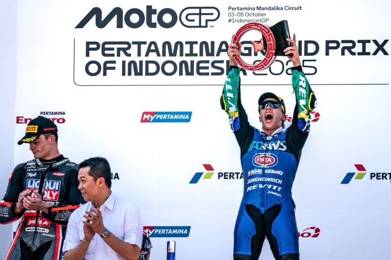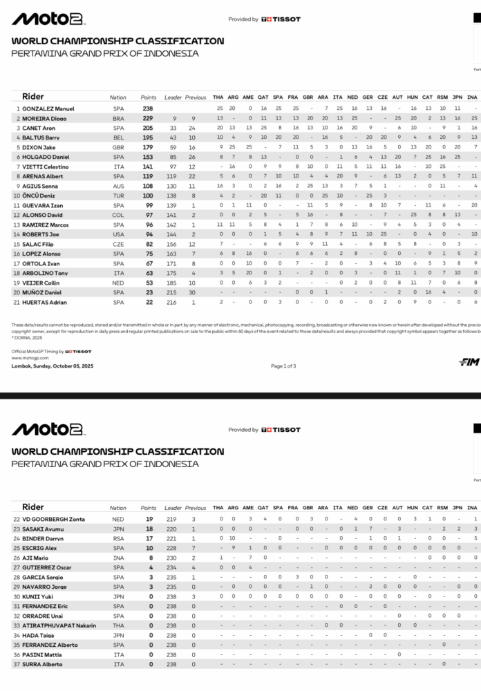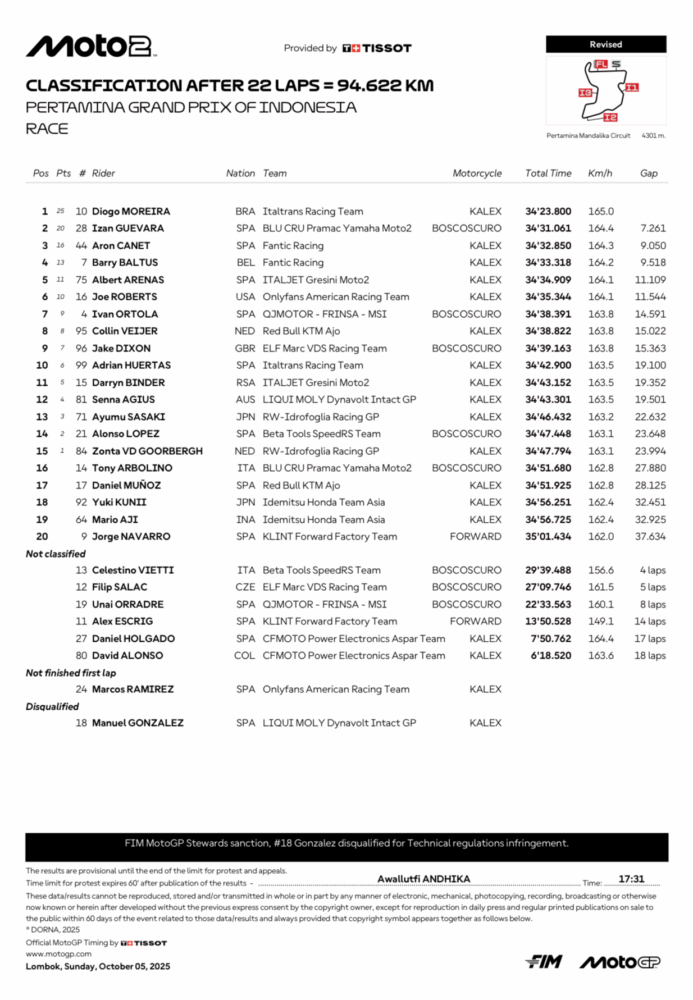 Diogo Moreira sigue metiendo presión en la pelea que mantienen por el título de Moto2 en 2025. El brasileño se impuso desde la pole en Mandalika, ante un Manu González que remontó desde la cuarta hasta la segunda posición, pero tres horas después llegó la información de su descalificación. Izan Guevara fue tercero, pero pasó a ser segundo y la baja de Manu también benefició a otro candidato al título, Aron Canet, que fue cuarto en pista y terminó sumando los puntos del tercer lugar.
