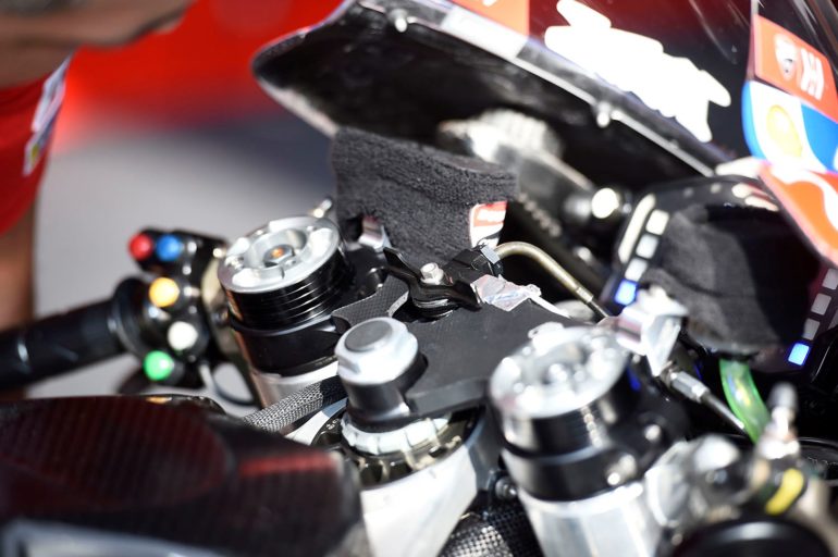 Si el sistema de Ducati funciona de similar manera a los de motocross, los pilotos aplicarían el freno delantero para que la moto se “planche” y luego girarían la perilla para bloquearla. No esta claro aun si el sistema del fabricante italiano afectaría también el basculante trasero o no.