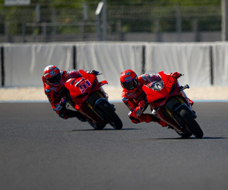 Con seis pilotos en pista y con motos de serie, la casa de Borgo le dio a Marc Márquez, Pecco Bagnaia, Alex Márquez, Fermín Aldeguer, Franco Morbidelli y Fabio Di Giannantonio la posibilidad de rodar en el trazado húngaro. También estuvo el probador Michele Pirro.