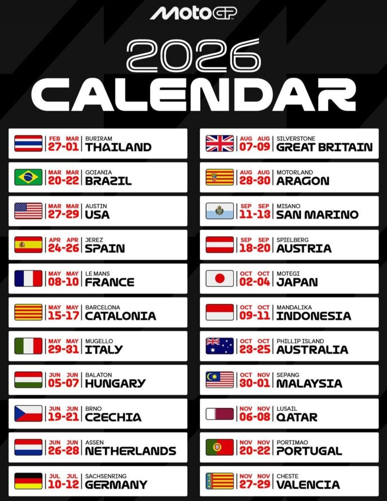 Tras un exhaustivo análisis de posibles escenarios y del calendario, se eligió la fecha de noviembre que obligó a un cambio: el GP de Portugal en Portimao se llevará adelante el 22 de noviembre, y la última fecha de Valencia pasó al 29 de noviembre. El resto de rondas del Campeonato del Mundo de MotoGP 2026 se mantendrán en sus fechas originales.