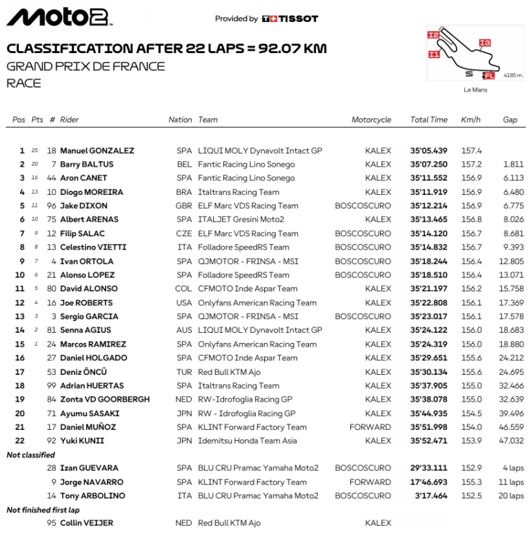 En Moto2, Manuel González (Liqui Moly Dynavolt Intact GP) logró su tercera victoria de la temporada y de manera contundente. En un sprint final que dejó a Barry Baltus (Fantic Racing Lino Sonego) en segundo lugar y completando el podio con Arón Canet (Fantic Racing Lino Sonego).
