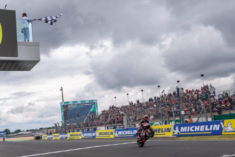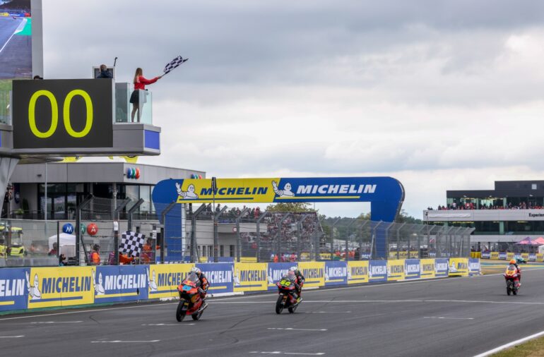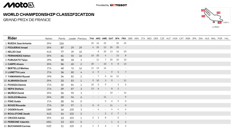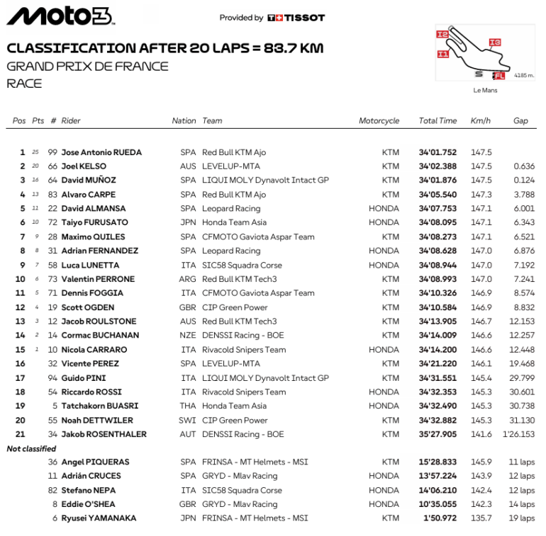 José Antonio Rueda se llevó su cuarta victoria del año de Moto3 en Le Mans y dio un paso importante en la lucha por el campeonato. El piloto del Red Bull KTM Ajo aprovechó un error de sus rivales, Joel Kelso (LEVELUP – MTA) y David Muñoz (Liqui Moly Dynavolt Intact GP), en la última curva para quedar primero y lograr el triunfo aprovechando también que Ángel Piqueras (Frinsa – MT Helmets – MSI) se fue al suelo y no sumó.