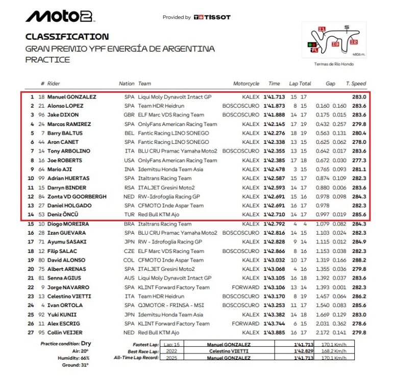 Manu González en Moto2 y David Almansa en Moto3 se adueñaron de los mejores registros del viernes. El argentino Valentin Perrone inició el Gran Premio de Argentina en P4 que lo coloca directo a Q1 para la Clasificación.