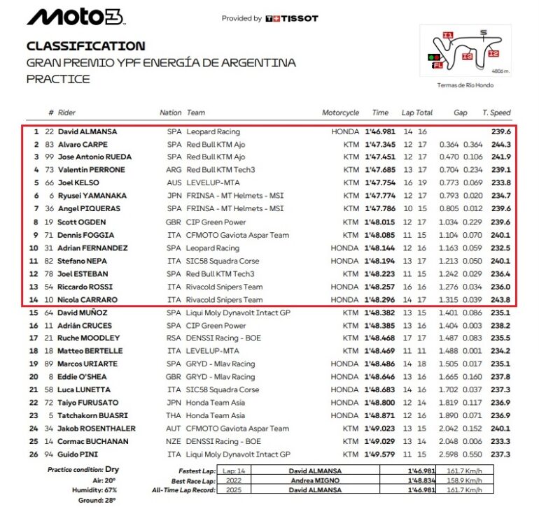 David Almansa marcó el tiempo de vuelta más rápido de Moto3 durante el entrenamiento en un Autódromo Termas de Río Hondo en seco el viernes por la tarde. El piloto del Leopard Racing fue el más rápido en el circuito argentino por delante de Álvaro Carpe y José Antonio Rueda.