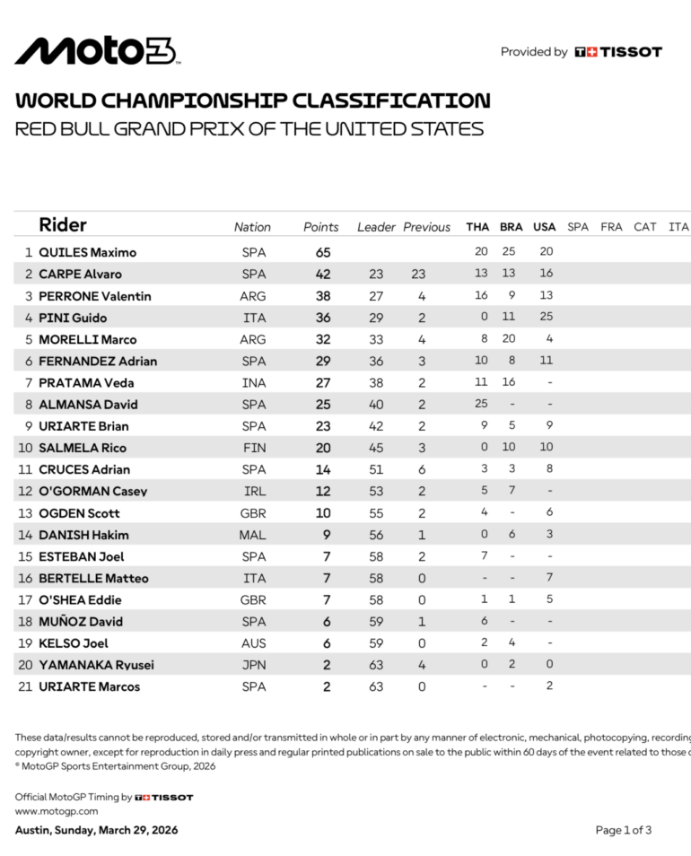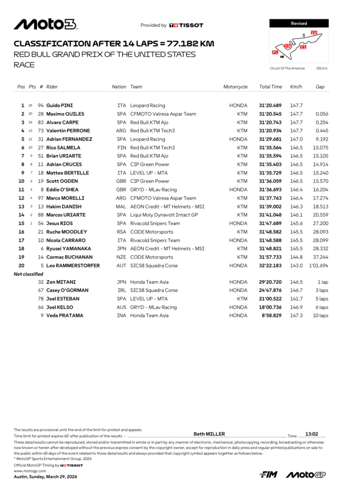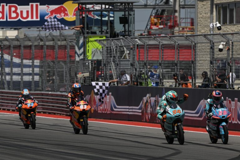 El italiano se impuso en una emocionante batalla en la última curva del circuito de COTA, logrando la victoria por tan solo 0.056 segundos y por primera vez en su segunda temporada en Moto3. El español Máximo Quiles (CFMoto Valresa Aspar Team) fue segundo y sigue líder del campeonato, y Álvaro Carpe (Red Bull KTM Ajo) completó el podio tras su ataque en la última curva al argentino Valentín Perrone (Red Bull KTM Tech3), que provocó que ambos se salieran de la pista y perdieran la oportunidad de un doblete.