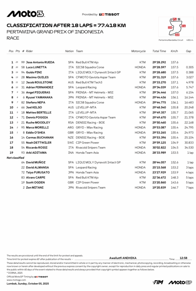 Por su parte Marco Morelli terminó en los puntos: 14° y volvió a sumar. Es la segunda carrera que acumula punto en 4 presentaciones y la primera vez con su actual equipo, el MLav.