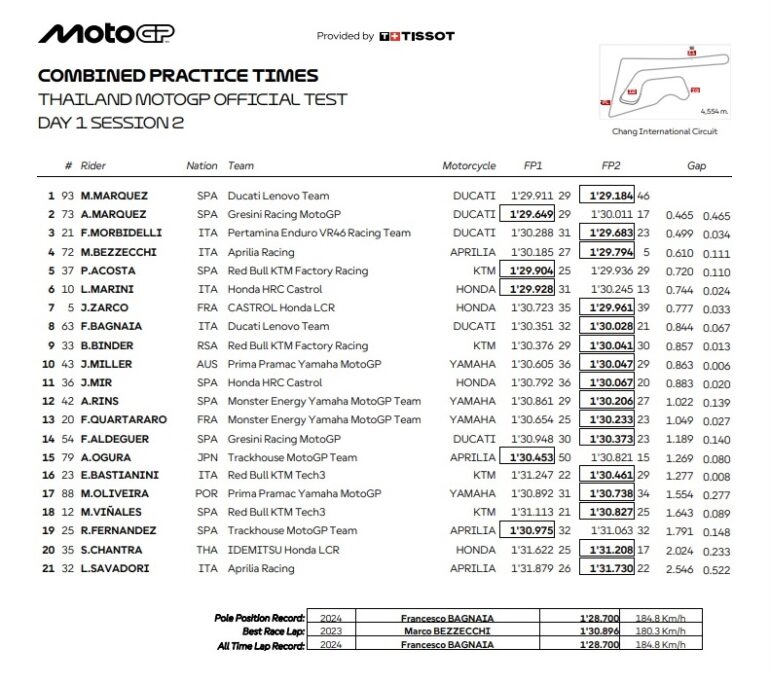 Marc Márquez y Alex Márquez marcaron el ritmo del primer día de los Test de Tailandia. El piloto oficial Ducati marcó el tiempo de vuelta más rápido este miércoles durante la madrugada argentina en el primer día del Test de Buriram.