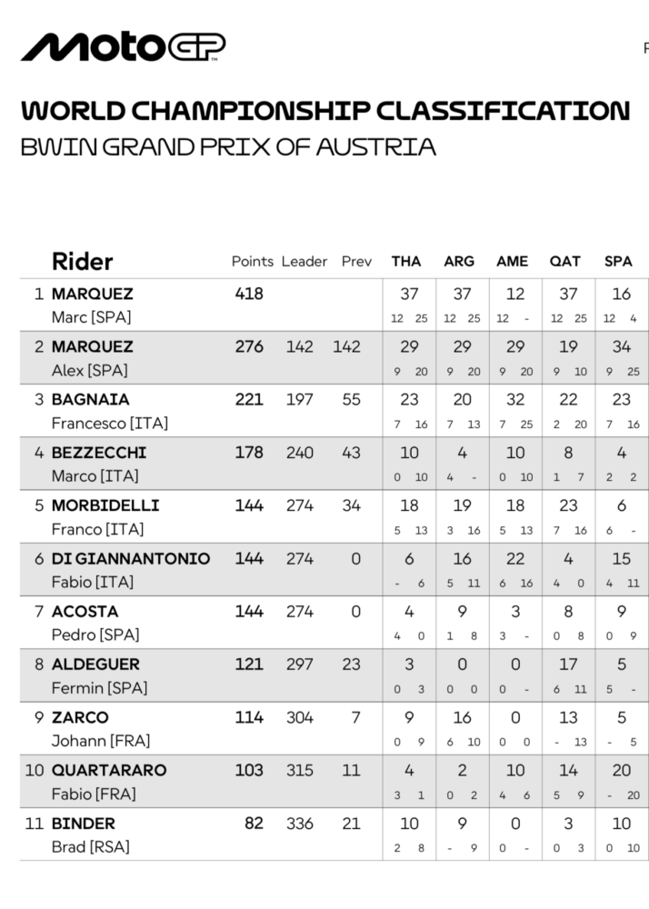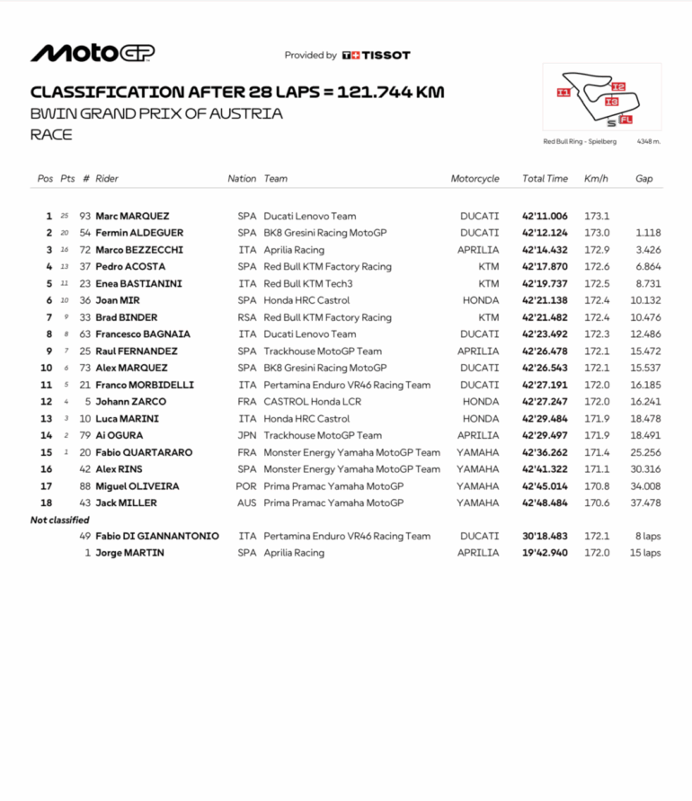 Marc Márquez (Ducati Lenovo Team) logró otro triunfo histórico, esta vez en un circuito donde, increíblemente, nunca había ganado: en el Red Bull Ring al lograr su sexto doblete consecutivo, algo que no conseguía desde 2014.