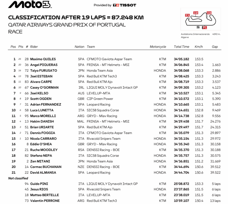Máximo Quiles (CFMOTO Aspar Team) se llevó la victoria en Portimao, la tercera de la temporada, tras ganar con ritmo en las últimas vueltas de una carrera de Moto3 en otro nutrido pelotón. El español se quedó con bandera a cuadros por sobre Ángel Piqueras (Frinsa – MT Helmets – MSI) y Taiyo Furusato (Honda Team Asia), que completaron el podio.