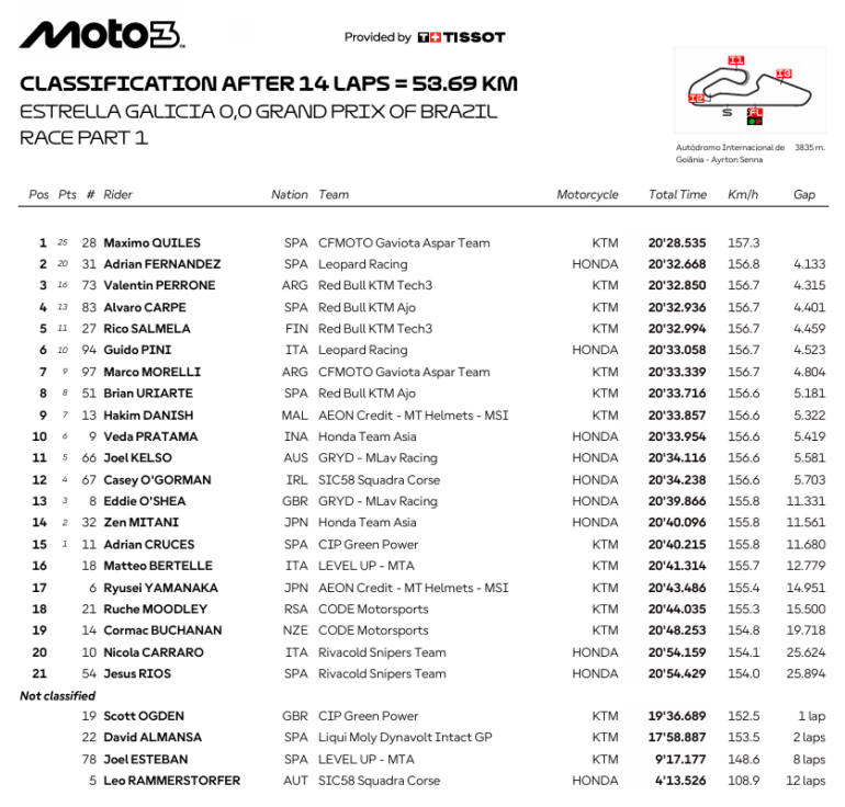 Brasil dejó un Gran Premio inolvidable en la categoría menor. Desde la primera salida, pasando por una bandera roja, hasta una última vuelta agónica tras la reanudación, la acción fue a lo Moto3.
