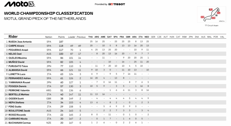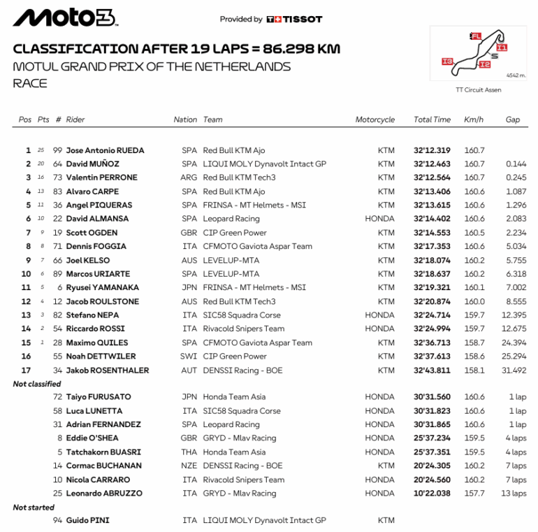 El argentino finalizó tercero en Assen, la catedral del motociclismo, en una carrera que terminó con roja por un accidente que se produjo en el inicio de la vuelta final. José Antonio Rueda fue el vencedor por sexta vez en el año.