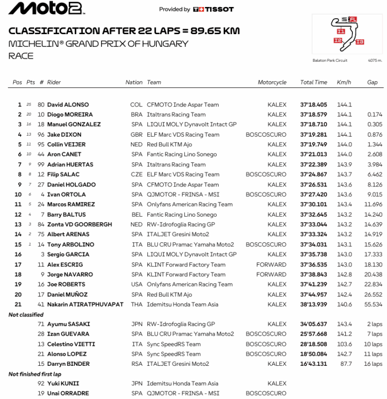 David Alonso (CFMOTO Aspar Team) hizo historia en Moto2 al convertirse en el primer piloto colombiano en ganar una carrera en la categoría intermedia. El rookie del Aspar Team largó 8° y en un ritmo de competencia impresionante, le permitió a cuatro vueltas del final alcanzar a los líder del Gran Premio de Hungría. El campeón de Moto3 dio cuenta de Diogo Moreira (Italtrans Racing Team) y el líder Manu González (Liqui Moly Dynavolt Intact GP), que fueron los dos principales protagonistas de toda la carrera. Entre el brasileño y el español estuvieron en la lucha por la victoria pero no contaban con la presencia de Alonso. El piloto de Aspar apareció en toda su dimensión y superó a ambos para lograr una victoria impresionante.