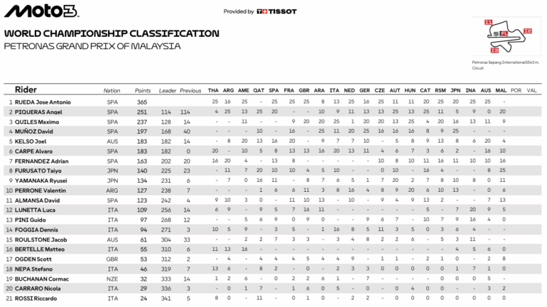 En un preocupante accidente en la previa de la carrera, los pilotos José Antonio Rueda y Noah Dettwiler fueron protagonistas de un inesperado momento en la previa de la final de Moto3 del GP de Malasia. El accidente se produjo cuando el piloto español se encontró en la curva 3 al piloto suizo, que giraba más lento que el resto.