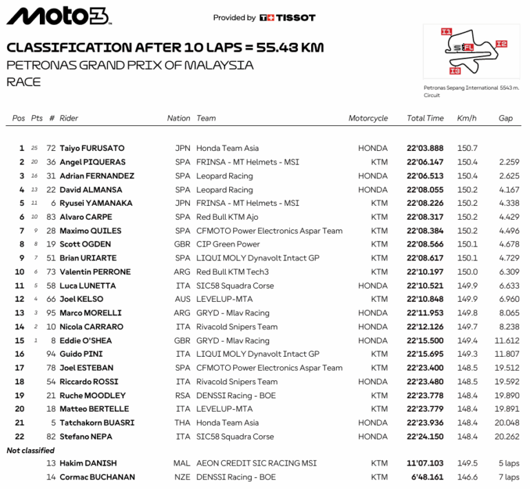 La victoria fue para Taiyo Furusato (Honda Team Asia) quien ganó por primera vez en el Mundial. Además también fue la primera de Honda esta temporada. Furusato superó a Ángel Piqueras (Frinsa – MT Helmets – MSI) y Adrián Fernández, completando un podio muy disputado. Máximo Quiles (CFMOTO Aspar Team) se proclamó ‘Rookie del Año’.