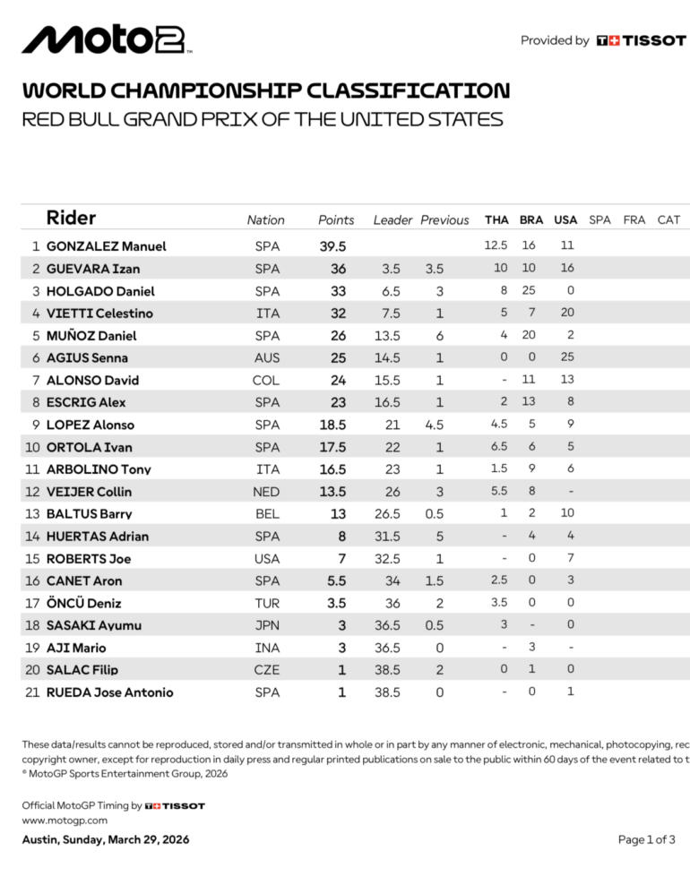 Alonso López (ITALJET Gresini Moto2) había tomado la punta en el comienzo con una colisión en la curva 1 que puso fin al Gran Premio del líder del campeonato, Daniel Holgado (CFMOTO Inde Aspar Team), y del local Joe Roberts (OnlyFans American Racing Team). Luego sucedió lo del incidente mayor y llegó la roja.