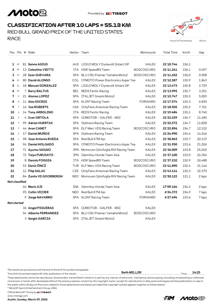 El australiano Senna Agius (LIQUI MOLY Dynavolt Intact GP) logró conseguir su tercera victoria en Moto2 y primera de éste 2026 tras una carrera que a poco de iniciada tuvo dos accidentes y una bandera roja.