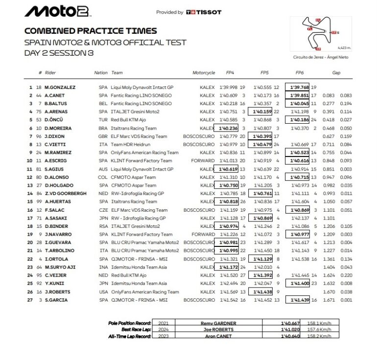 Con sol y menos viento que el primer día, los Test en el Angel Nieto de Andalucía, tuvieron a los locales como dominadores. En Moto2 por primera vez se logró bajar el 1:40 y fue el piloto español Manuel González que con 1.39.768, mejoró la referencia anterior de la categoría que tenía el norteamericano Joe Roberts en 2024 con 1:41.020.