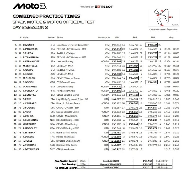 En Moto3, también se mejoraban los tiempos con respecto a la jornada inicial: en este caso no rompían récords pero estuvieron cerca. El dominio fue de los pilotos españoles: David Muñoz (Liqui Moly Dynavolt Intact GP), Angel Piqueras (MT) y José Antonio Rueda (Red Bull KTM Ajo) fueron los mejores tres.