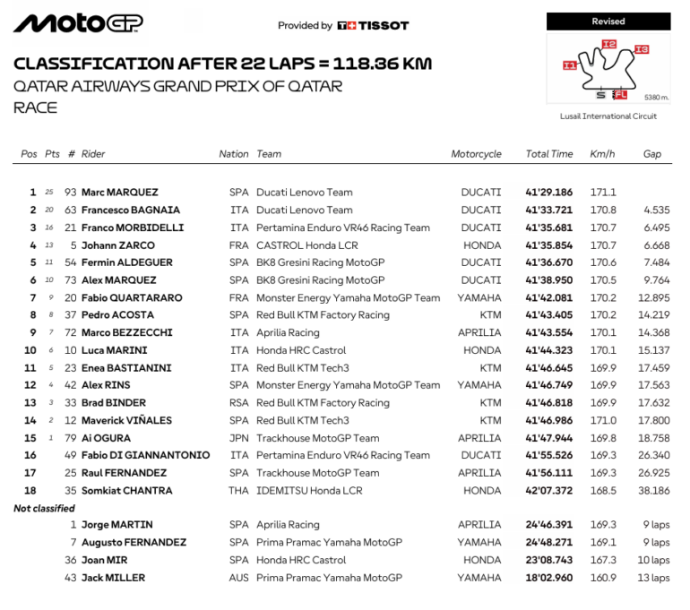 Lo otro negativo: Maverick Viñales hizo un carrerón, terminó 2° en podio con la KTM pero lo bajaron por presión en los neumáticos y el recargo lo dejó 14º. Bagnaia y Morbidelli así entonces completaron el podio de Ducati.
