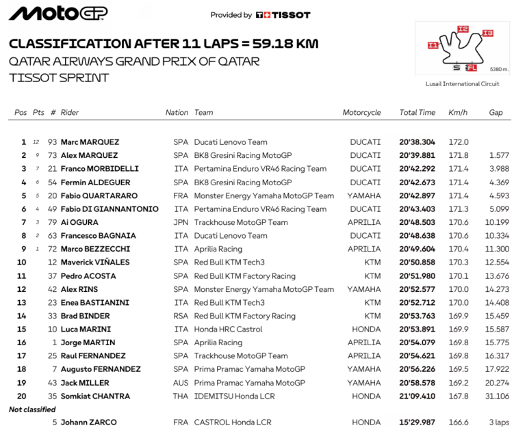 Nadie pudo con Marc, sólo Marc… y en éste juego de palabras es porque el catalán se repuso de un toque con su hermano, administró la Ducati y sacó diferencias cuando lo tenía que hacer. Acrecentó así sus números: 70 pole, cuarta victoria en fila en Sprint, 114 podios alcanzando a Jorge Lorenzo y tres victorias sobre cuatro en 2025.