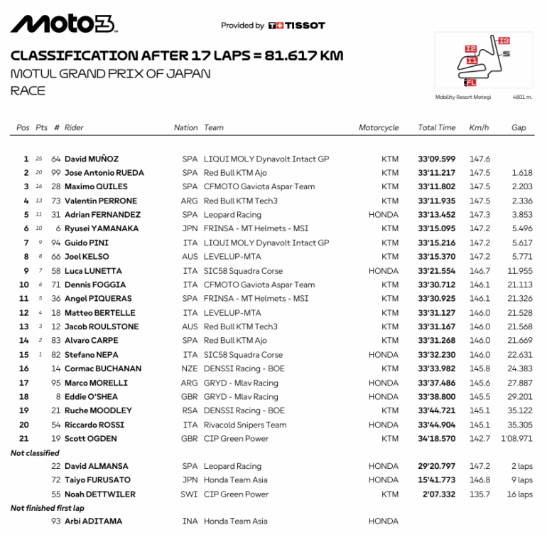 El Campeonato del Mundo de Moto3 tiene a los pibes grandes. David Muñoz ganó con inteligencia al aprovechar un momento de incertidumbre de carrera: empezó a caer una leve llovizna y apretó para sacar diferencias y mantenerla. José Antonio Rueda se recuperó tras el cese de las gotas y volvió a su ritmo para lograr un excelente podio que lo deja más cerca del título aprovechando que Angel Piqueras se cayó, volvió a pista pero terminó en 11° ubicación.