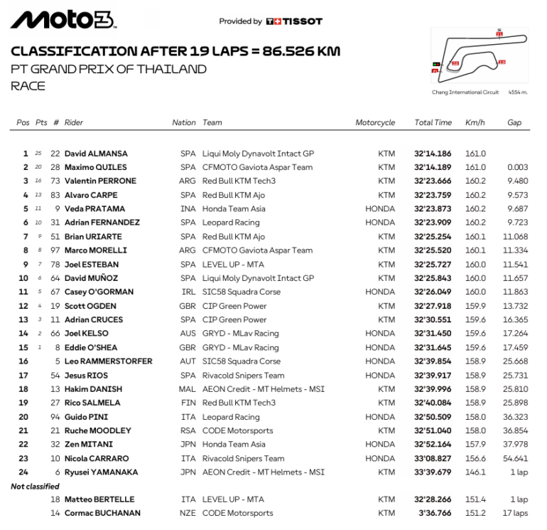 Perrone metió podio otra vez. Morelli debutó con Top Ten (Puesto 8) en Tailandia. Almansa y Quiles terminaron a 0.003 (¡!!!!!¡) y ganó David…