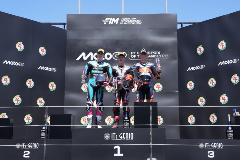 Con David Almansa partiendo desde la ‘pole’, el español supo defender su posición con firmeza desde el primer instante, resistiendo el intenso empuje de Álvaro Carpe (Red Bull KTM Ajo) y Máximo Quiles (CFMOTO Aspar Team), que intentaron cerrarle todos los espacios en los primeros metros.