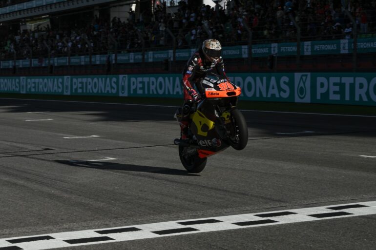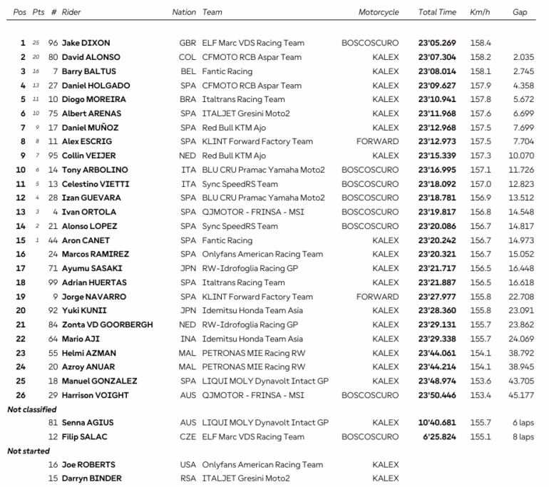 David Alonso (CFMOTO Aspar Team) fue segundo, mientras Barry Baltus (Fantic Racing Lino Sonego) completó el podio. La lucha por el campeonato vivió un giro inesperado con la caída de Manuel González (Liqui Moly Dynavolt Intact GP) y la escalada de Diogo Moreira (Italtrans Racing Team) al Top 5.