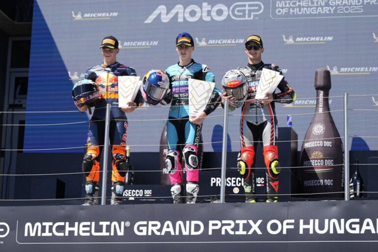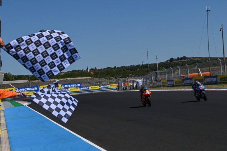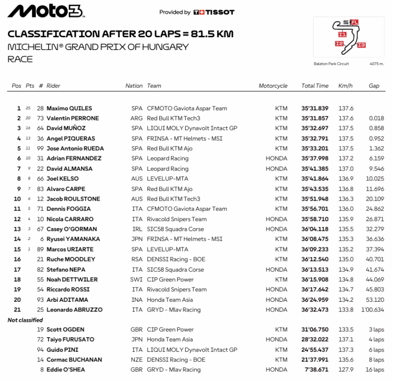 Máximo Quiles (CFMOTO Aspar Team) logró su segunda victoria de la temporada en Moto3™ tras un final emocionante. Quiles y Perrone (Red Bull KTM Tech3) protagonizaron un duelo que se definió en la línea de meta y por tan solo 18 milésimas. El líder del campeonato, José Antonio Rueda (Red Bull KTM Ajo) fue 5° y mantiene ahora una ventaja de 69 puntos sobre Ángel Piqueras del MT, quien terminó en el 5° puesto.