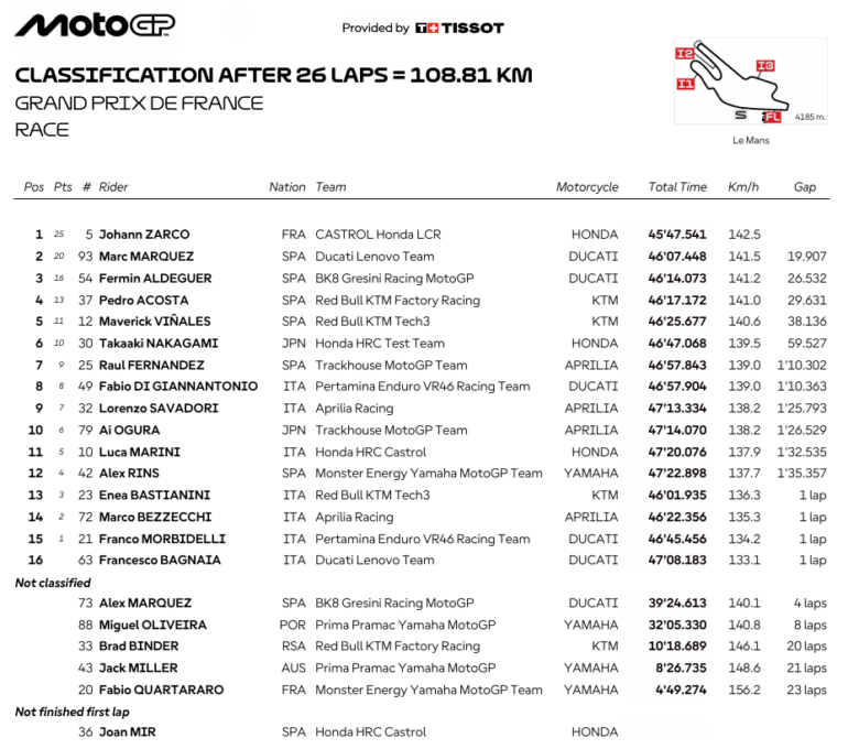 Después de 71 años que ganara Pierre Monneret en 1957, Francia volvió a celebrar una victoria en su casa en la categoría reina. Johann Zarco del CASTROL LCR Honda supo leer como nadie una carrera tan impredecible como emocionante. El francés apostó desde el primer momento por los neumáticos de lluvia y fue el único que no entró en ningún momento a cambiar de moto, a diferencia del resto de pilotos.